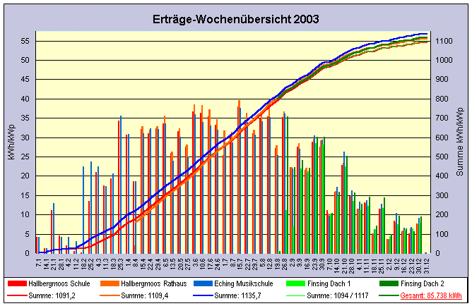 Erträge für Hallbergmoos Schule (+20° West / 20°) Erträge für Hallbergmoos Rathaus (+25° West / 22°, Flachdach) Erträge für Eching Musikschule (-35° Ost / 37°) Erträge für Finsing Dach1 (+30° West / 15°) Erträge für Finsing Dach2 (+30° West / 31°)